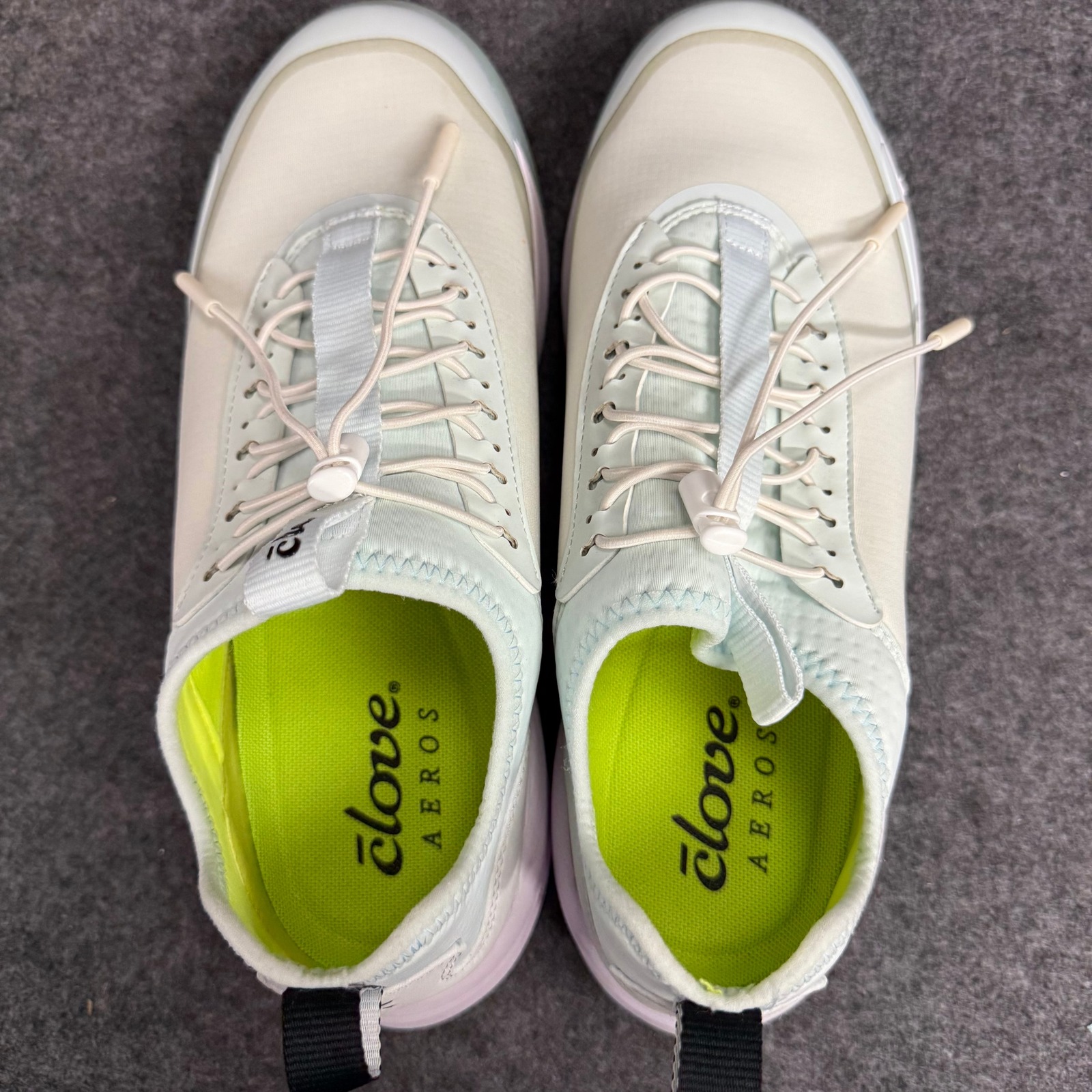 Clove Aeros slip-on sneakers in a refreshing mint green hue. These comfortable shoes feature a pull-on design with elastic laces for a secure and easy fit. The bright neon green interior lining adds a pop of color and a touch of energetic style. Perfect for everyday wear, travel, or light athletic activities.