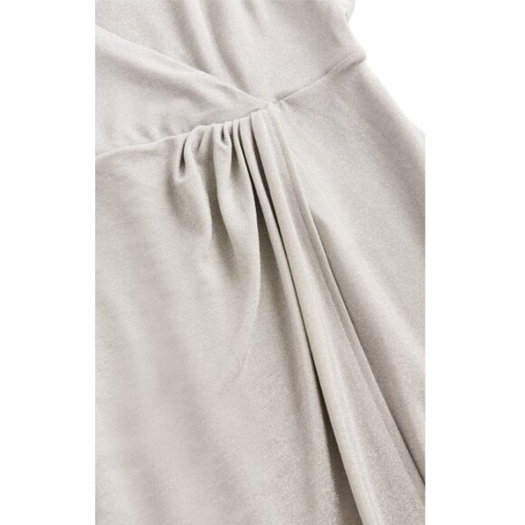 Featuring a faux wrap silhouette and long sleeves, this silver dress is sure to have all eyes on you.